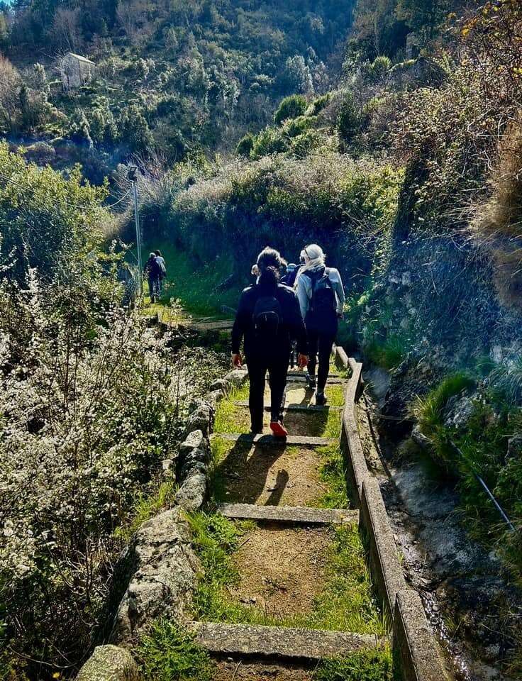 Accès au hammam privé et à la grande piscine en plein air, taillée dans la roche, du hameau Rosumarinu